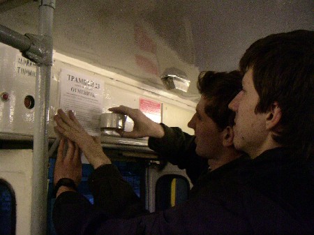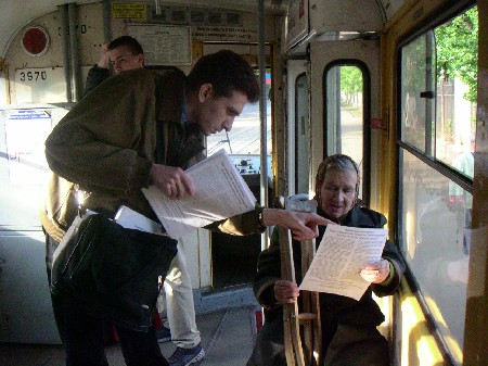 Здесь представлена только небольшая часть нашей огромной работы. Но борьба продолжается. И нам требуется Ваша помощь! Для этого просим Вас по мере своих возможностей распечатать объявления, о которых здесь говорилось и расклеивать их по всей трассе 23-го маршрута. Делать это нужно ежедневно. Где-то их сорвали, где-то оторвали квиточки. Можно ехать на 23-м, смотреть состояние объявлений и менять при необходимости. Объявление в формате Word есть здесь. Щелкните мышью и оно раскроется. Нужно еще расклеить объявления на столбах, на досках объявлений, в подъездах домов, близлежащих к трассе 23-го трамвая. Кроме того нам нужна помощь в раздаче листовок. Последняя версия листовки и письма жителя лежит здесь. Просьба распечатать ее с двух сторон и раздавать пассажирам 23-го трамвая по всей трассе, плюс в трамваях других (6, 10, 15, 21, 27, 28, 30) краснопресненских маршрутов. Мы Вам будем очень признательны. И тому есть пример. Огромное спасибо автору вот этой оригинальной листовки, расклеенной по трассе 23-го трамвая!